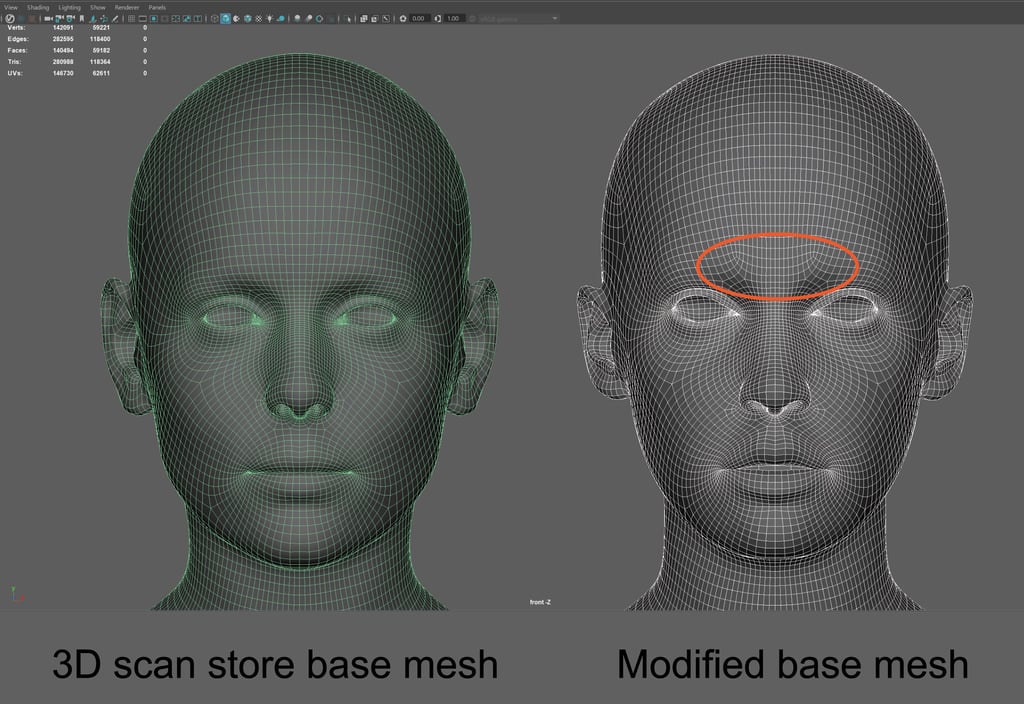 Change the topology on the forehead to support the expression. Import the head mesh to Maya and retopologize using Quad draw tool.
