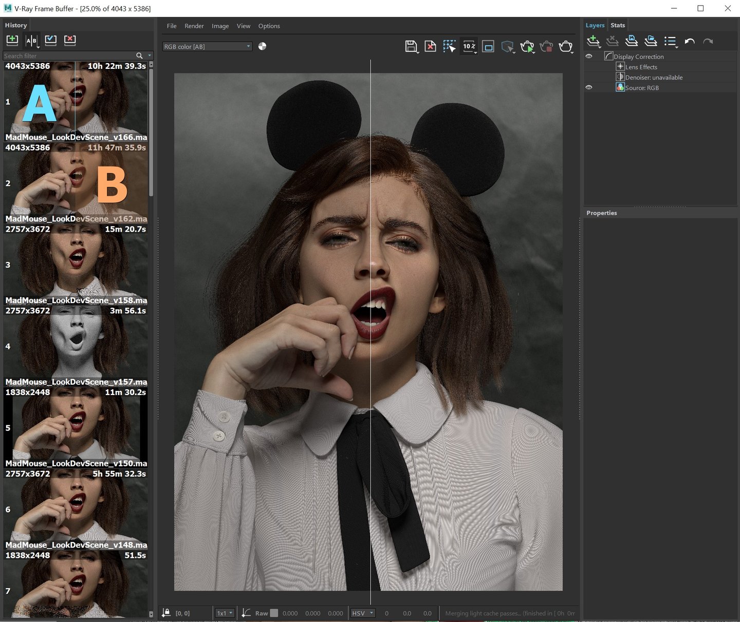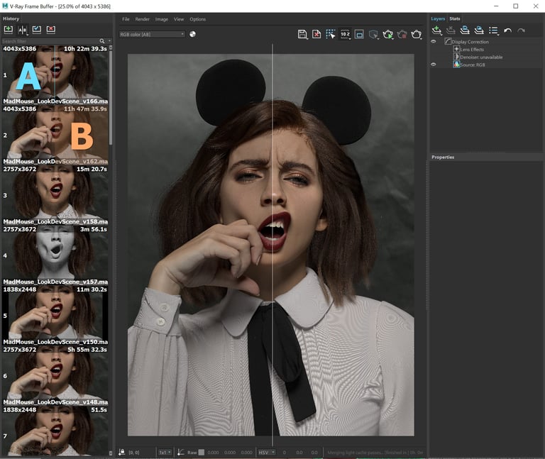 When the project is close to the end stage, it requires minor fixes. Don’t underestimate this crucial step. Even tiny changes can make a huge difference. Use the History section A|B in V-Ray Frame Buffer window to compare the current rendering and the previous ones.