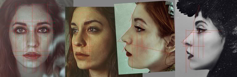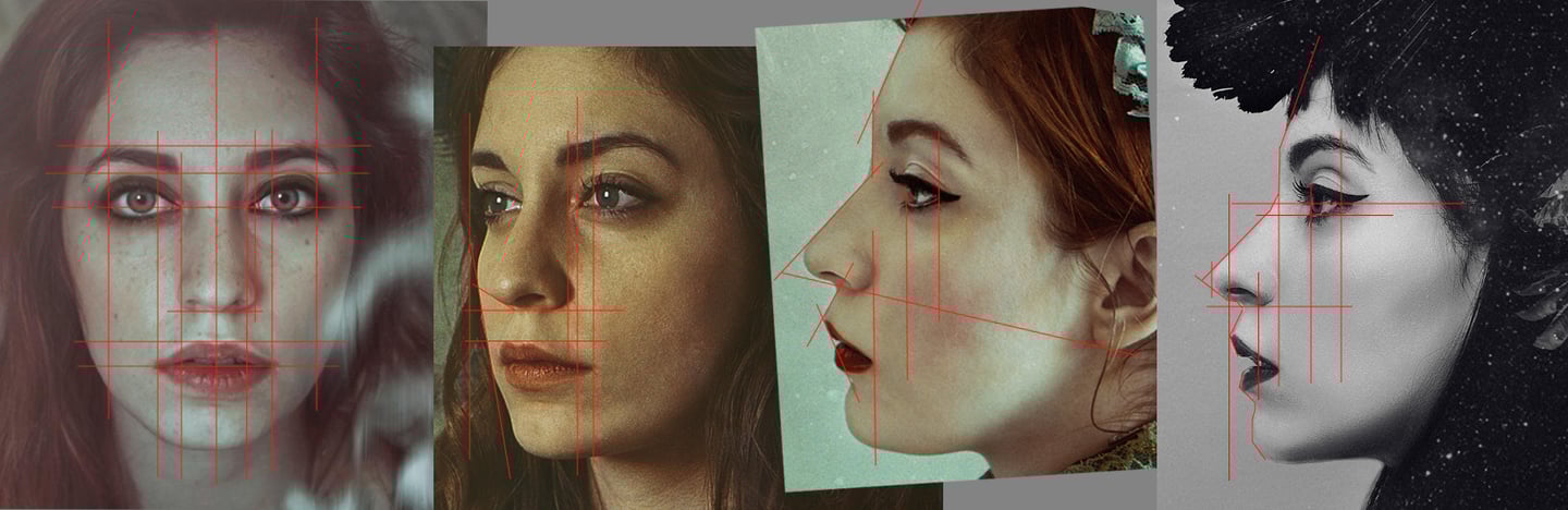 It is important to study the facial structure before the setup of base mesh in ZBrush. Line up the reference images using guides in Photoshop. Draw a few lines to see where the plane changes occur and where the face features line up. Pay attention to negative spaces on the profile views.