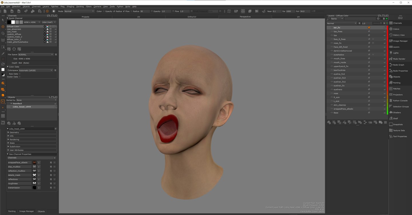 After transferring the maps, make corrections on the skin in Mari. Some pore details around the eyes and nose area can get messy. Use Paint Through Tool to make the changes.