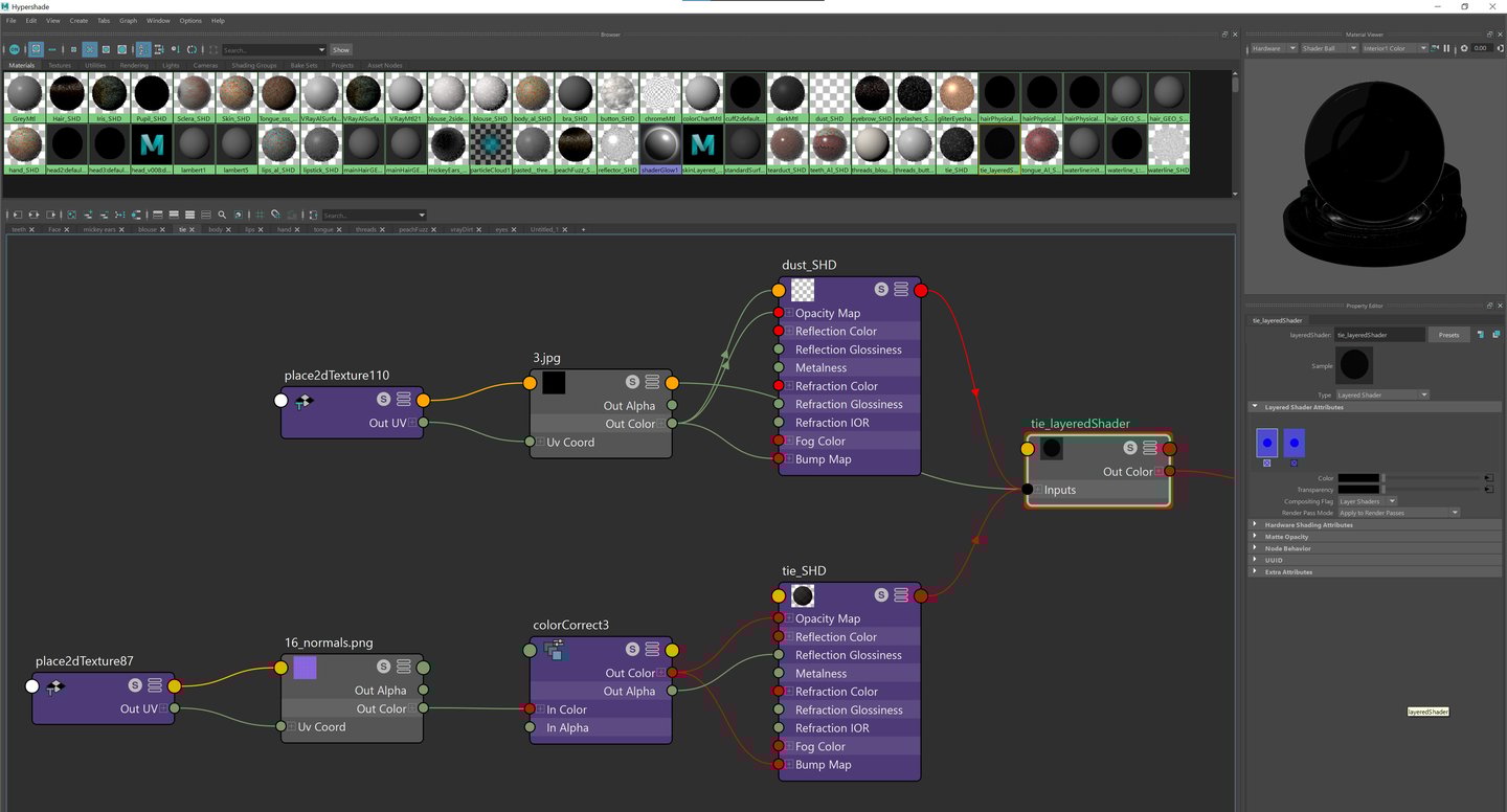 Create textures in Mari and use VrayAlsurface to add textures for head, hand, teeth, tongue and body. Use VrayMtl for the rest. The face is made with 3 different shaders and they are layered by lipstick, eye shadow and Skin in that order.