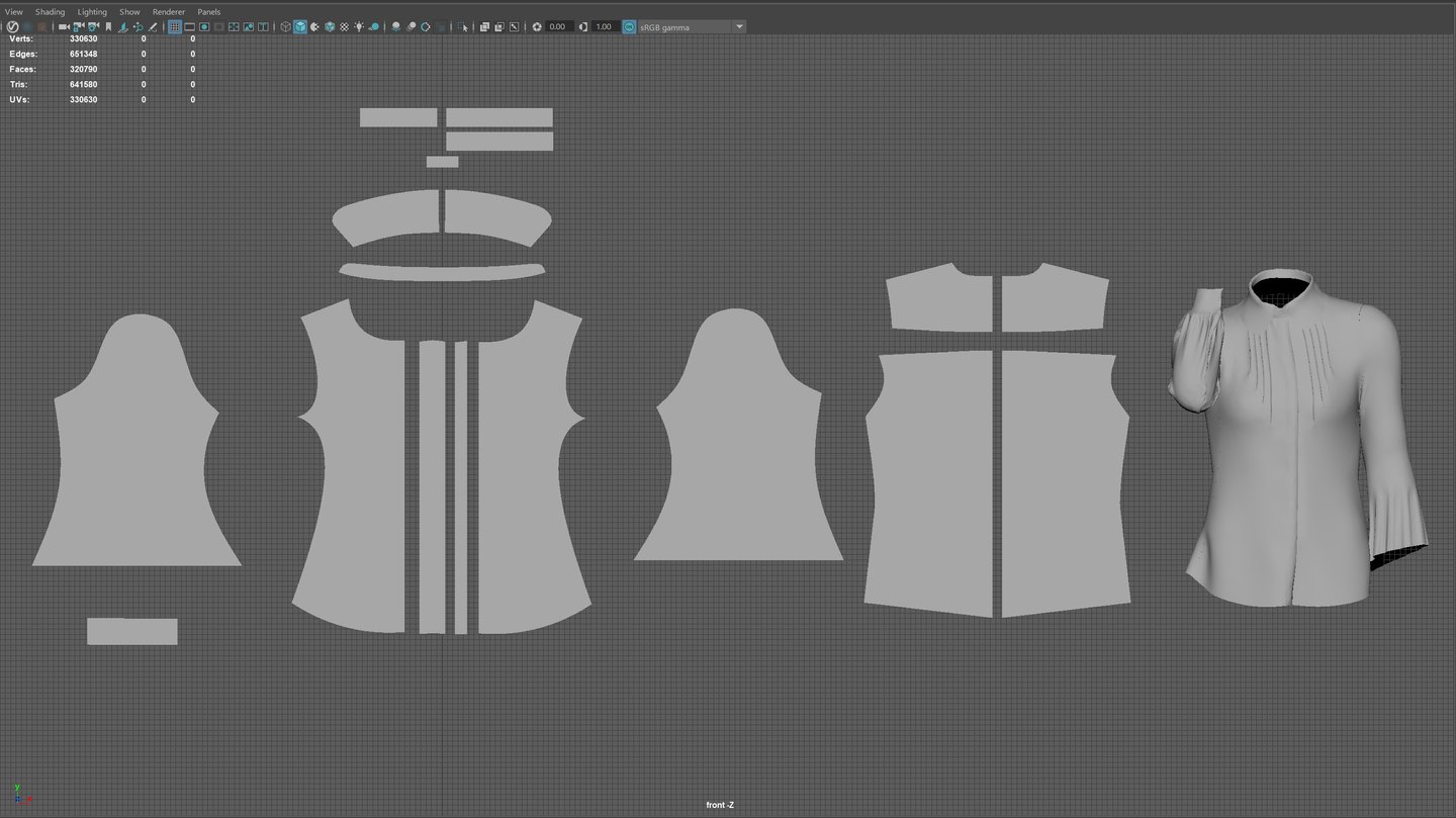 Once the head base mesh is in a good shape in ZBrush, export the head to Maya and retopologise if needed and then UV the head. To UV clothing, you can use a great tutorial on Artstation by Derrick Sesson. This tool is helpful with retopologising the clothing that are imported from Marvelous Designer.