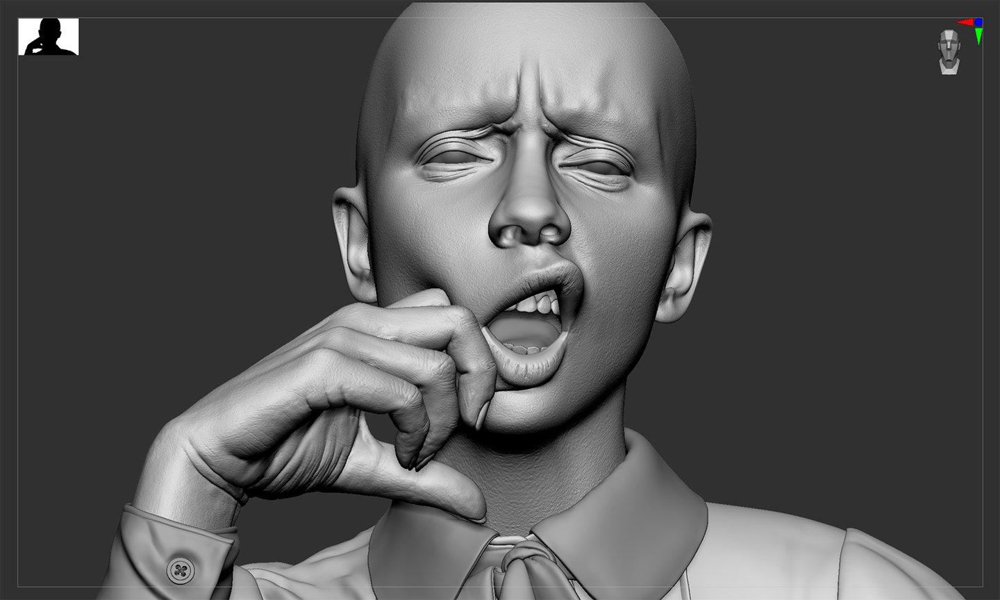 The most challenging part of this project was capturing the likeness. Since the concept has a very strong expression and the pose is not neutral, it can be hard to get the likeness and maintain the correct anatomy.