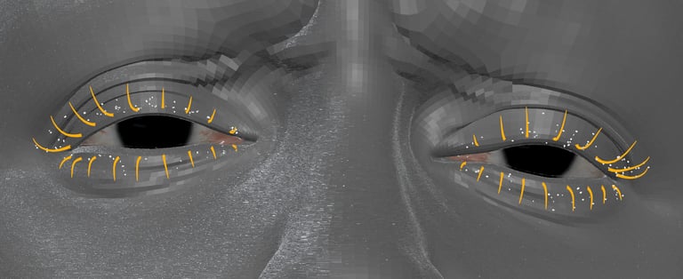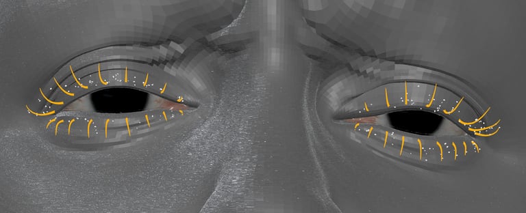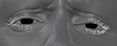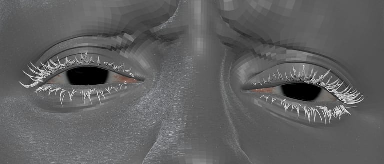 After adding hair on the eyelashes, add mascara crumbs by creating a small geo and use MASH network in Maya to scatter over the eyelashes. You can also manually add the geo on the eyelashes.