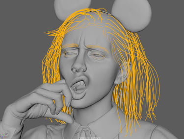 Draw lines of the hair flow on the concept image. This will help with where to place the guides in XGen. Once the shape of head mesh is good, duplicate faces in 3 sections; Head Scalp, eyebrows and eyelashes. Separating them will give you more control over making hair in XGen. Make sure the UV is in 0-1 UV space. Freeze transformations. Apply Lambert shader. Use the guides to generate the first clumping map. Add at least two more Clumping modifiers to refine the hair. Once Clumping is working, add Noise and Cut modifiers to change the texture of the hair. Explore other modifiers if necessary for your character.