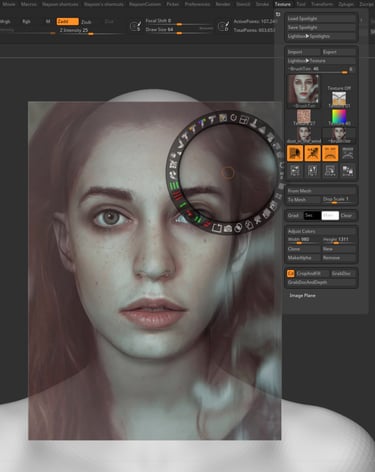 The first method is to use Spotlight in ZBrush. Import the image in texture and turn on Spotlight. Adjust the size of the reference image to match the base mesh. Once the alignment is done, save the camera.