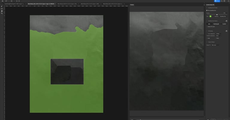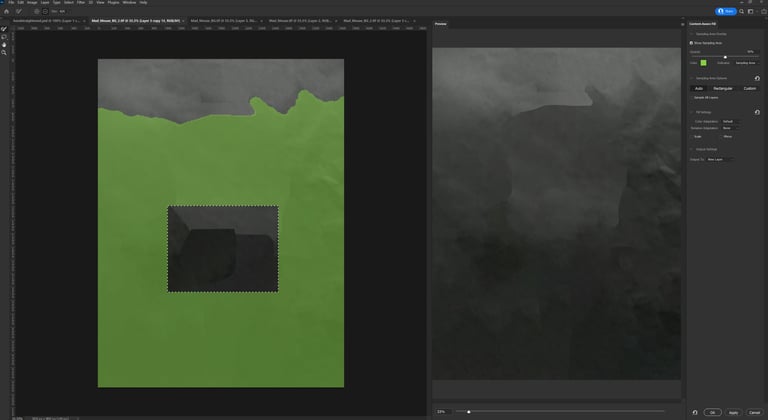 A few backgrounds were created during the process. However these background didn’t feel right with the concept, so the background from the photograph was used to composite the renders together. Remove the model using Content_Aware Fill under Edit in Photoshop. It doesn’t have to be perfect in the middle since the mesh will cover the area.