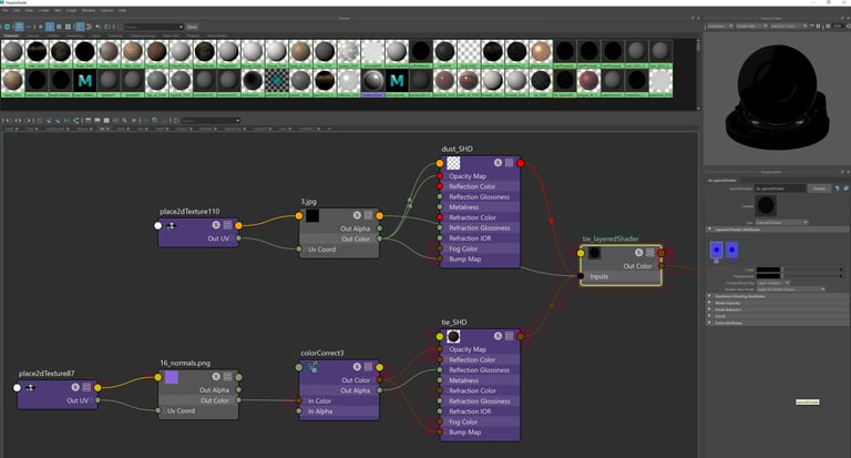 Use Layered shader node to add the dust on top of the tie shader. Make sure to lower the intensity of the dust colour so it is subtle on the black tie.